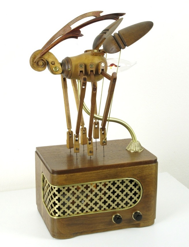 One of my favorite examples of techno-art is his Firefly sculpture. The mashup of piano parts, violin neck, flicker bulb, furniture parts, an old radio, brass, gears, motor, lamp hardware and knobs really give this a distinctive look that still hearkens back to an actual firefly, while the clever use of motors and gears make this little animatronic creation even more whimsical.