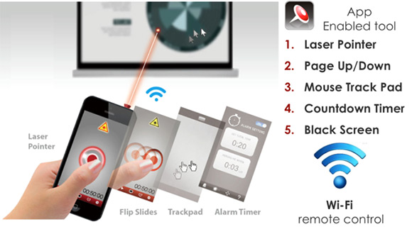 This Indiegogo crowdfunding smash-hit, the iPin, gives the seminar speaker a laser pointer and a presentation clicker on their own phone to perform wireless presentations.